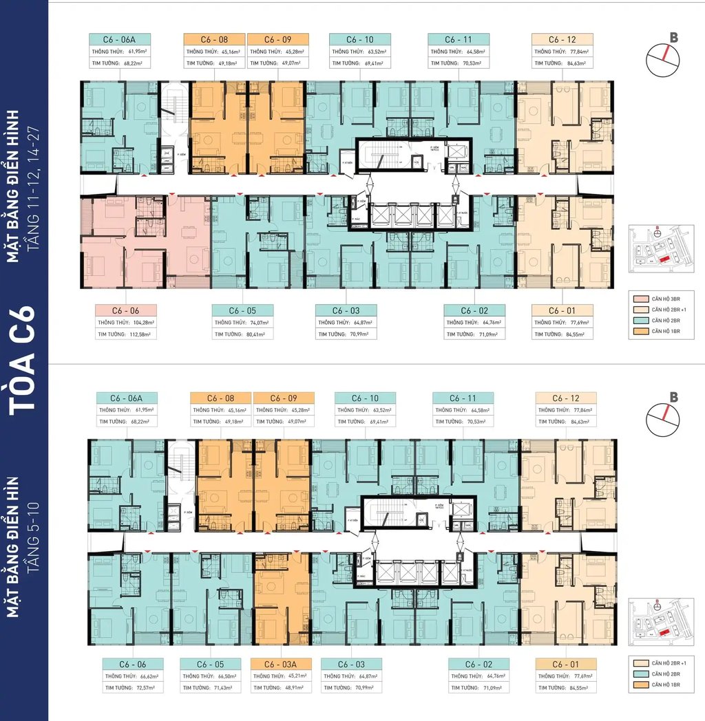 Diện tích: từ 63,3 m² – 67,2 m² – 64,9 m²